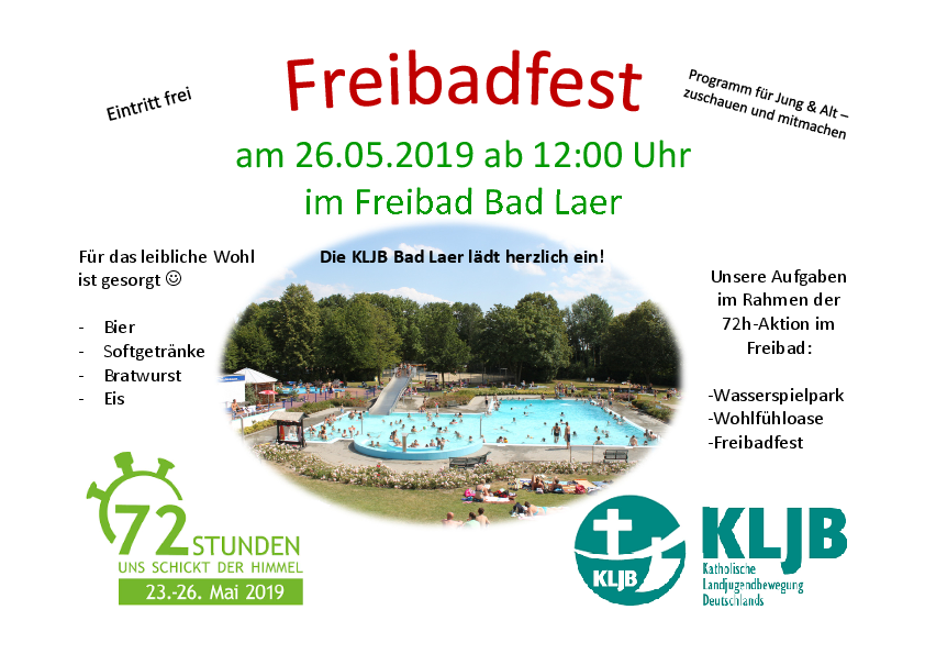 Im Rahmen der 72-Stunden-Aktion schafft die Katholische Landjugendbewegung an diesem Wochenende im Bad Laerer Freibad neue Anziehungspunkte. Innerhalb von drei Tagen sollen ein Wasserspielpark und eine Wohlfühloase geschaffen und am Sonntag ein großes Freibadfest für Jedermann veranstaltet werden. Bei diesem bekommen alle interessierten Gäste die Gelegenheit, die neu geschaffenen Attraktionen gleich selbst auszuprobieren. Dafür ist der Eintritt ins Freibad den ganzen Tag frei!