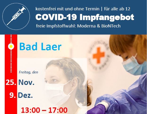 Am Freitag, den 09.12.2022 ist wieder ein Mobiles Impfteam (MIT) des Landkreises Osnabrück in Bad Laer. Es wird möglich sein, sich in der Zeit zwischen 13:00 Uhr und 17:00 Uhr in der Gaststätte Plengemeyer, Glandorfer Str. 27, 49196 Bad Laer, impfen zu lassen. Über die Anforderungen einer Impfung informiert der Landkreis Osnabrück auf https://corona-os.de/ . Bitte beachten Sie die entsprechenden Informationen! Über weitere Impfaktionen informieren sich Interessierte bitte tagesaktuell.