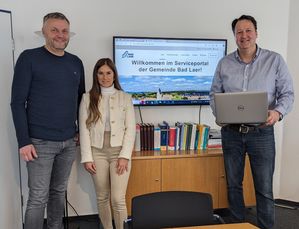 Untertitel Foto: Jens Giesker (Fachbereichsleiter Zentrale Aufgaben, Bildung), Sibel Sal (Digitalisierungsbeauftragte) und Bürgermeister Tobias Avermann begrüßen die neue digitale Dienstleistungsfähigkeit der Gemeinde Bad Laer. (Foto: Gemeinde Bad Laer)