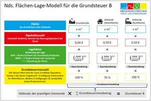 Während sich der Belastungsgrund des Verkehrswertmodells des Bundes aus dem Leistungsfähigkeitsprinzip ergibt, baut das als Vorbild für Niedersachsen herangezogene bayerische Flächenmodell auf dem Äquivalenzprinzip auf. Der Plan des Niedersächsischen Finanzministeriums sieht ergänzend vor, das Flächenmodell um einen Lagenfaktor zu einem Flächen-Lage-Modell zu erweitern. Mit dem Lagefaktor würde, so das Fazit, die kommunale Gegenleistung noch besser typisiert, erfasst und abgebildet. Zunächst setzt die Finanzverwaltung die Grund und Boden- beziehungsweise Gebäudeflächen des Steuerpflichtigen in Quadratmetern zum kommunalen Nutzungsangebot in Relation. Das Gesetz definiert zu diesem Zweck Äquivalenzzahlen, mit denen für jeden Quadratmeter Fläche über einen bestimmten Geldbetrag ein Nutzungsäquivalent des Grund und Bodens beziehungsweise des Gebäudes ermittelt wird.