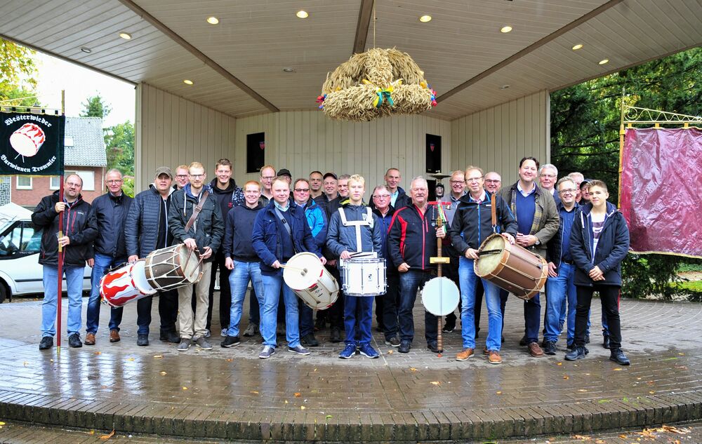 Gemeinsam mit den Ortsbürgermeistern, Trommlern und Vertretern der einzelnen Ortsteile begann der Leinewebermarkt mit dem traditionellen „Antrommeln“ des Markttreibens. Sternförmig trafen die Abordnungen der einzelnen Ortsteile am Thieplatz zusammen und hingen die von der Landjugend gefertigte Erntekrone am Musikpavillon auf. „Entgegen der Annahme, hat das Flechten der Erntekrone großen Spaß gemacht“, versicherten die Landjugendvertreter.